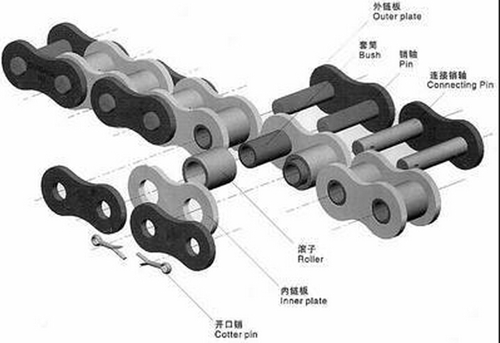 由鏈板、鏈銷、軸套等部件組成;同一品種的鏈條按節距、排數、鏈條寬度以及極限拉伸載荷的不同劃分規格。