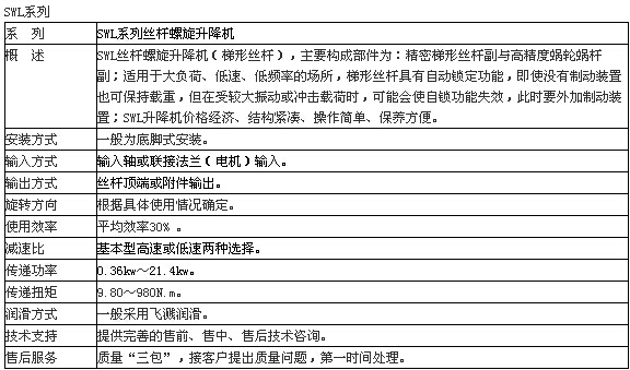 SWL系列蝸輪絲桿升降機是一種基礎(chǔ)起重部件,符合JB/T8809—1998(原JB/ZQ4391—86)標準。該產(chǎn)品可廣泛用于機械、冶金、建筑、化工、醫(yī)療、文化衛(wèi)生等各個行業(yè)。承載能力2.5—120T。具有結(jié)構(gòu)緊湊、體積小、重量輕、動力源廣泛、噪音小、安裝方便、使用靈活、功能多、配套形式多、可靠性高、使用壽命長等優(yōu)點。具有提升、降落、推進、翻轉(zhuǎn)等功能,可以單臺或組合使用。能按一定程序準確地控制調(diào)整提升或推進的高度,可以用電動機或其它動力直接帶動,也可以手動。最高輸入轉(zhuǎn)速1500r/min,最大提升速度2.7m/min。有不同的結(jié)構(gòu)型式和裝配方式,提升高度按用戶的要求制造。該裝置可以自鎖。